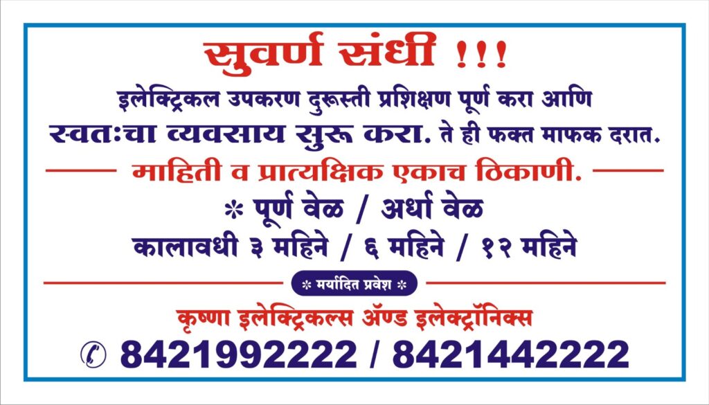 Krushna Electrical & Electronics, founded by Sachin Rathod, is dedicated to empowering small business owners and aspiring professionals. With 20+ years of hands-on expertise, Krushna Electrical & Electronics not only offers top-notch repair and maintenance services but also provides practical training to help individuals build successful careers in the electrical and electronics field. Their goal is to support skill development and foster growth for the next generation of technicians and entrepreneurs.